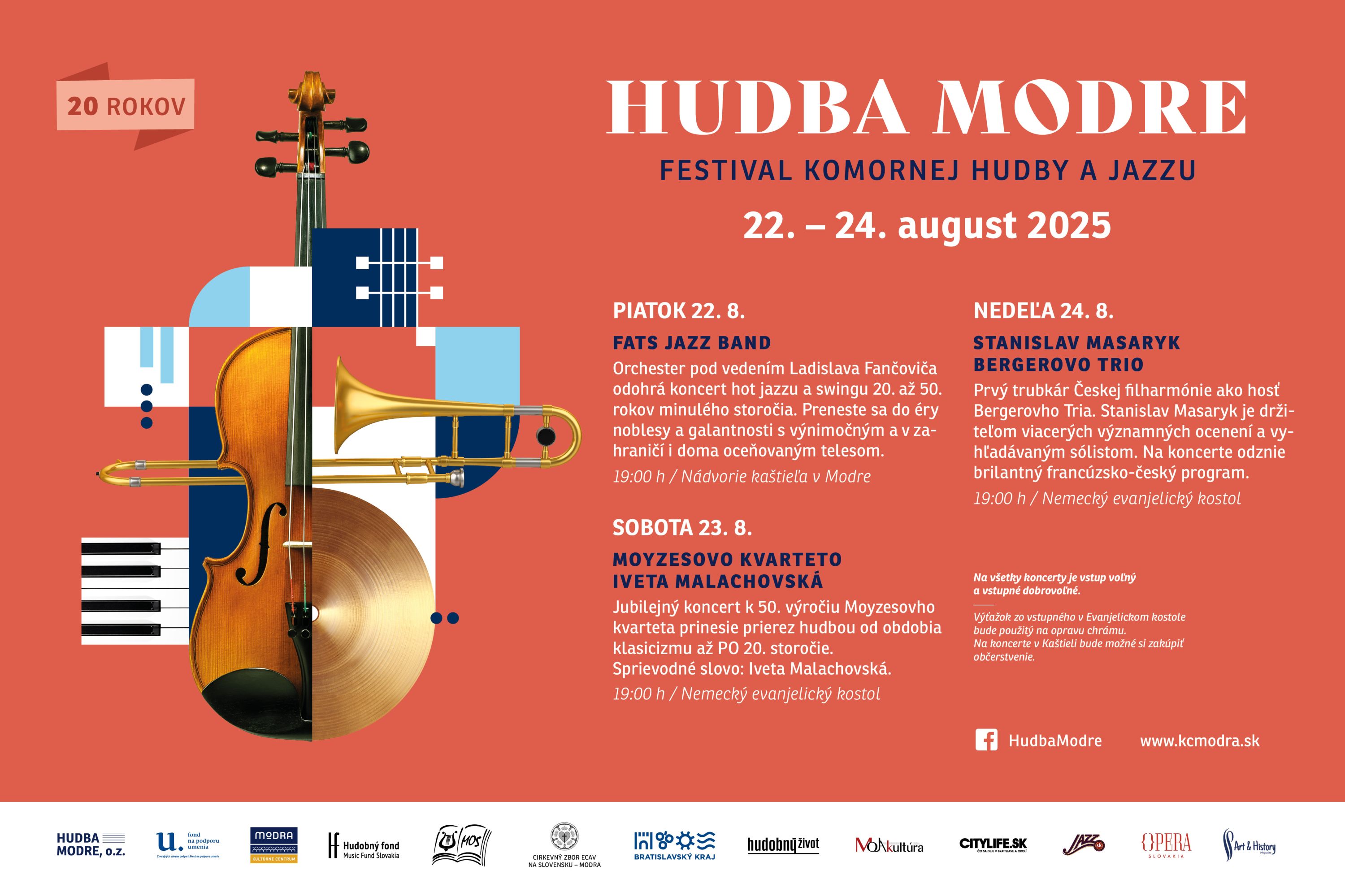 Občianske združenie Hudba Modre organizuje lokálny festival s významom presahujúcim malokarpatský región. Prináša klasickú hudbu a jazz v tej najvyššej kvalite a inak tomu nebude ani tento rok. Jubilejný 20. ročník festivalu Hudba Modre prinesie počas víkendu od piatku 22. augusta do nedele 24. augusta 2025 do malebného vinárskeho mesta pod Karpatmi to najkvalitnejšie zo slovenskej klasickej a jazzovej hudobnej scény.