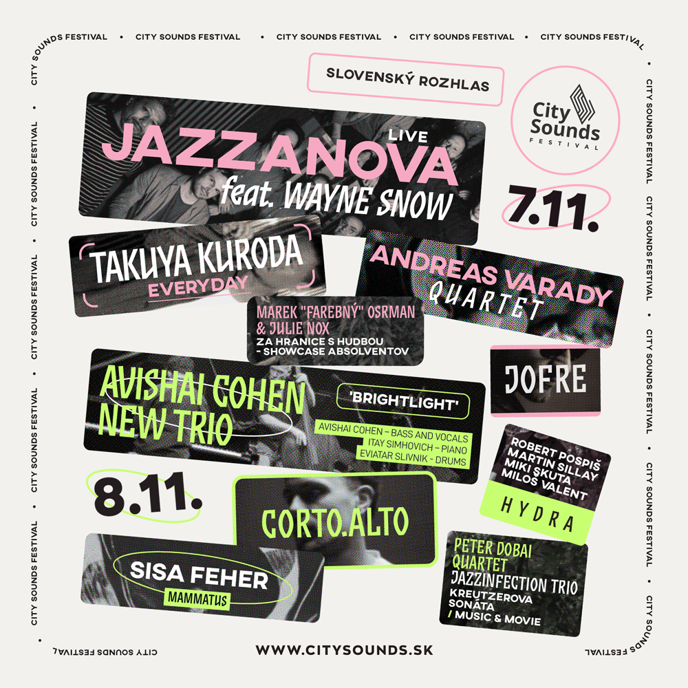 Začiatkom novembra sa Bratislava opäť stane pulzujúcim centrom súčasnej hudby. City Sounds Festival prinesie počas piatka 7. novembra a soboty 8. novembra špičkových svetových hudobníkov, ale aj výnimočných domácich umelcov ako Sisa Michalidesová, Peter Dobai, Sisa Fehér, zoskupenie 1000 Plôch alebo projekt Hydra Roberta Pospiša, Martina Sillaya, Mikiho Skutu a Miloša Valenta. Headlinermi aktuálneho 11. ročníka budú Avishai Cohen, Jazzanova Live s Waynom Snowom, Takuya Kuroda či corto.alto.