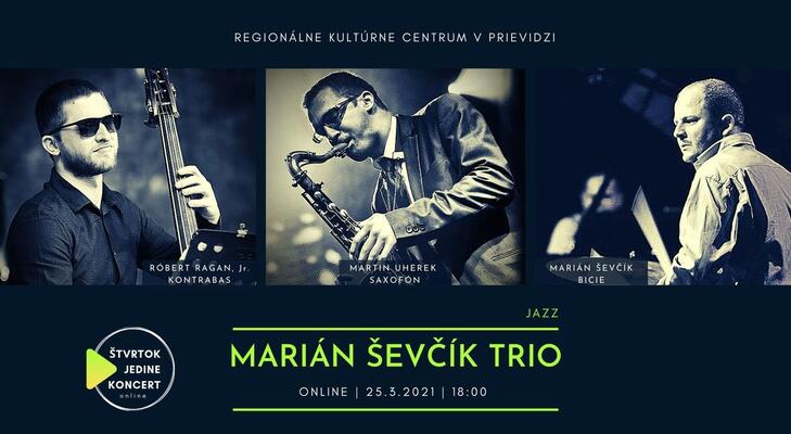 Vo štvrtok 25. 3. 2020 sa v Regionálnom kultúrnom centre v Prievidzi uskutoční online koncert zaujímavej kapely. V rámci cyklu koncertov "Štvrtok? Jedine koncert! JAZZ" vystúpi trio nášho vynikajúceho bubeníka - Mariána Ševčíka. Jeho spoluhráčmi budú kontrabasista Robert Ragan jr. a saxofonista Martin Uherek.