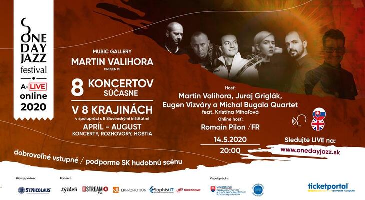 Už zajtra, vo štvrtok 14. mája 2020, prinesie tradičné medzinárodné podujatie One Day Jazz Festival vo svojej online edícii druhý zo série ôsmich koncertov. Hudobníci z domácej scény – Martin Valihora, Eugen Vizváry, Juraj Griglák, Michal Bugala a hosť - Kristína Mihaľová sa spoja s hudobníkom z Francúzska, jazzovým gitaristom Romainom Pilonom. Koncert bude na stránke onedayjazz.sk k dispozícii zdarma, fanúšikovia však majú možnosť hudobníkov a organizátorov podporiť kúpou dobrovoľnej vstupenky.