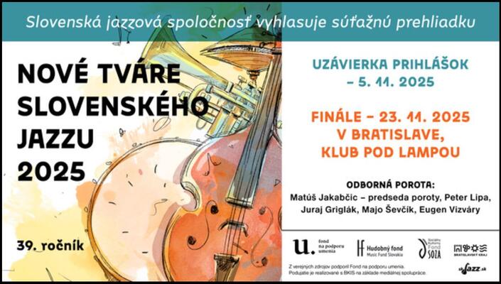 Aj tento rok vyhlasuje Slovenská jazzová spoločnosť súťažnú prehliadku Nové tváre slovenského jazzu 2025, v rámci ktorej odborná porota (Peter Lipa, Juraj Griglák, Marian Ševčík a Eugen Vizváry) pod vedením gitaristu a pedagóga Matúša Jakabčica vyberie na základe zaslaných prihlášok s nahrávkami finalistov. Tí sa následne v nedeľu 23. novembra 2025 predstavia a zahrajú pred odbornou porotou. Vybraným skupinám preplatí Slovenská jazzová spoločnosť cestovné náklady a poskytne základné nástrojové vybavenie, najlepšie skupiny (prípadne jednotlivci) získajú finančné odmeny a diplomy.