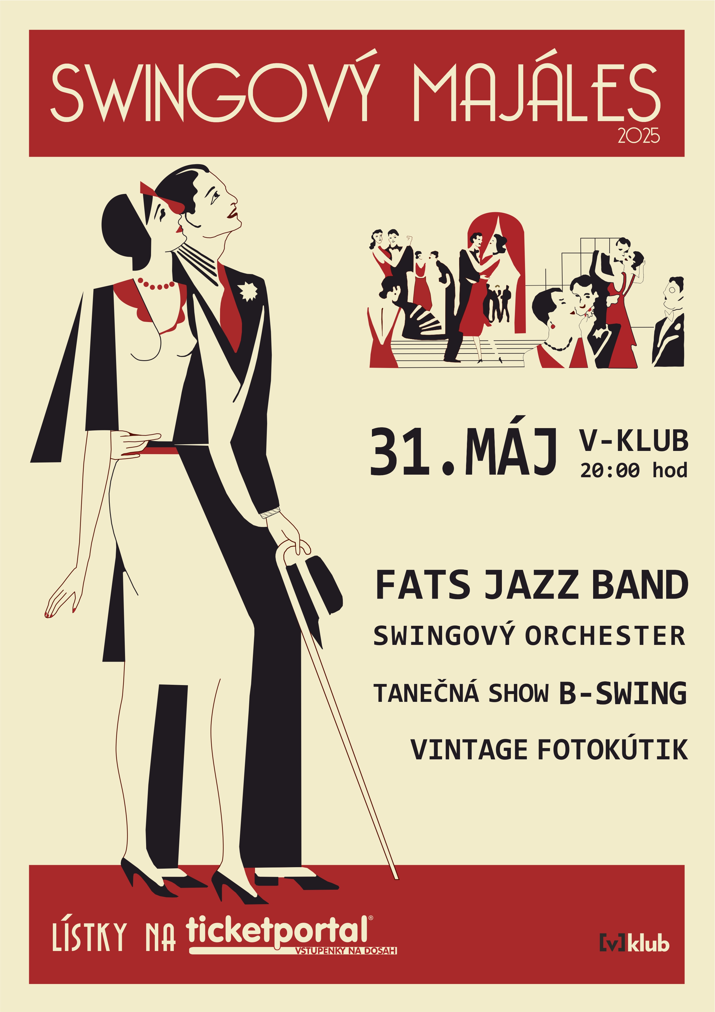 Bratislava bude opäť tancovať tak, ako bude pískať swingový orchester FATS JAZZ BAND: čiže v duchu prvej republiky. Dlhoročná tradícia májových tanečných zábav opäť ožije už túto sobotu 31. mája 2025 v legendárnom V-klube na Námestí SNP v Bratislave. O hudobnú produkciu sa počas posledného májového večera postará spomínaný swingový orchester pod vedením Ladislava Fančoviča a atmosféru dotvoria workshop dobových tancov tanečnej školy B-Swing či tradičný vintage fotokútik.