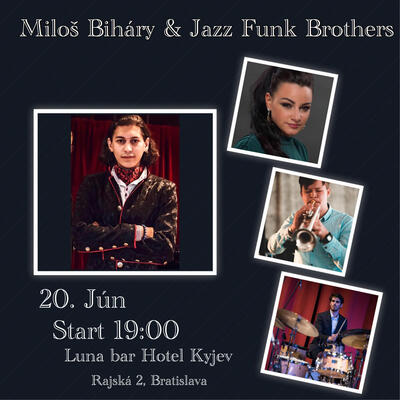 Nenechajte si ujsť koncert plný jazz-Funk nákladu mladej kapely obklopenej okolo mladého virtuózneho pianistu Miloša Biharyho — MILOŠ BIHÁRY & JAZZ FUNK BROTHERS , ktorá Vám predstaví spolu so speváčkou ANETTE široký repertoár od vlastných úprav jazzových štandardov ,funkov, taktiež aj jazzfunk úpravy klasickej hudby az po vlastné kompozície . Pozývame Vás na tento jedinečný koncert ,ktory sa uskutoční v stredu 20.juna 2018 v bratislavskom Luna bare .