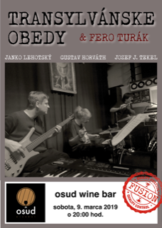 Milí Osudoví priatelia, tak znova prišiel čas zahájiť koncertné Osudové Soboty, a s kým iným ako s našou obľúbenou kapielkou TRANSYLVÁNSKE OBEDY aj s Ferom Turákom, ktorý je už jej stálym hosťom na klávesy a trombón, a možno aj niečo zaspieva či zascatuje. Tento koncert bude ako obvykle v štýle fusion, groove či melodického jazz-rocku, v programe sú autorské kompozície (ako napr. You Know, Krízová situácia, ... ), ale aj viacero štandardov od svetových velikánov ako Miles Davis, Herbie Hancock, Billy Cobham, Jimmy Smith aď.